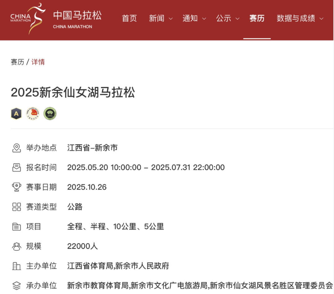 继今年初获世界田联标牌赛事认证后,2025新余仙女湖马拉松于近日通过中国田径协会A1类赛事认证,成为继南昌马拉松之后,省内第二家取得中国田协A1+世界田联标牌“双认证”的路跑赛事。