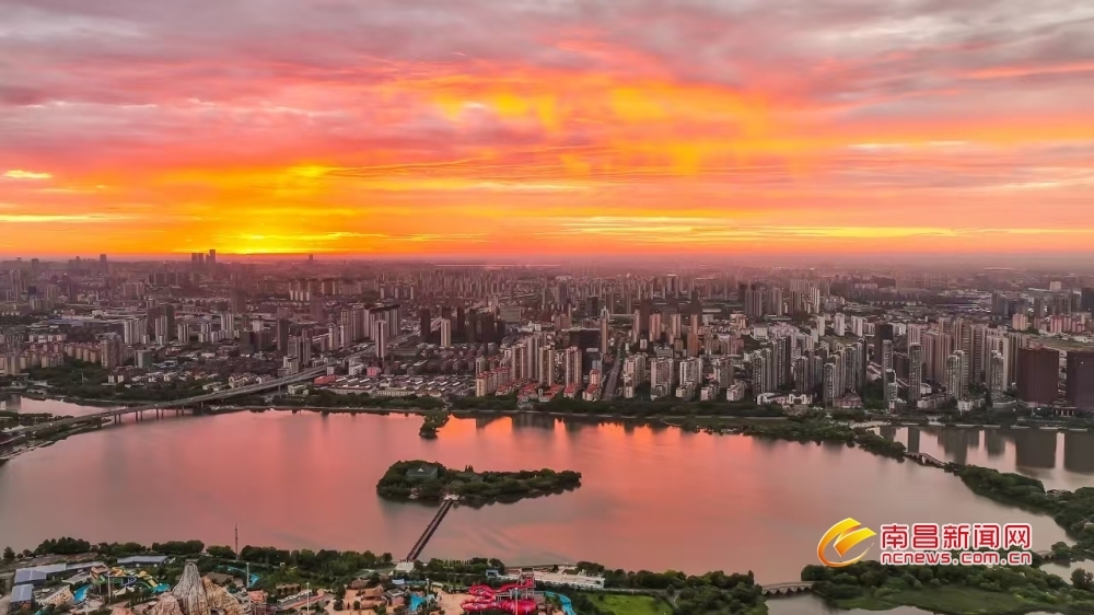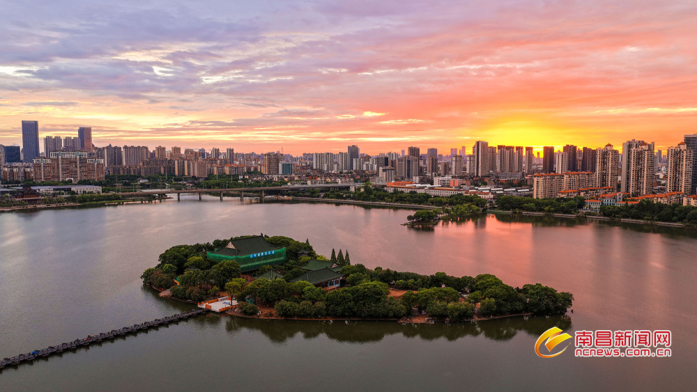 南昌新闻网讯 7月23日清晨,在象湖湿地公园,随着太阳渐渐升起,朝霞透过云层印染了天色,静谧的湖面倒映着霞光,为湖中心的豫章书院镀上一层紫红色的柔纱,美丽景色令人陶醉。(潘卫文 洪观新闻记者 马悦 文/图)