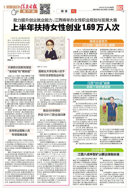 7月23日,由江西省政府新闻办、省妇联联合主办的2025年江西省女性职业规划与发展大赛新闻发布会在南昌召开。今年大赛各赛道初赛或遴选推荐于5月至9月由各设区市、高校分别组织,复赛、决赛暨颁奖仪式分别于9月至10月下旬由大赛组委会组织。