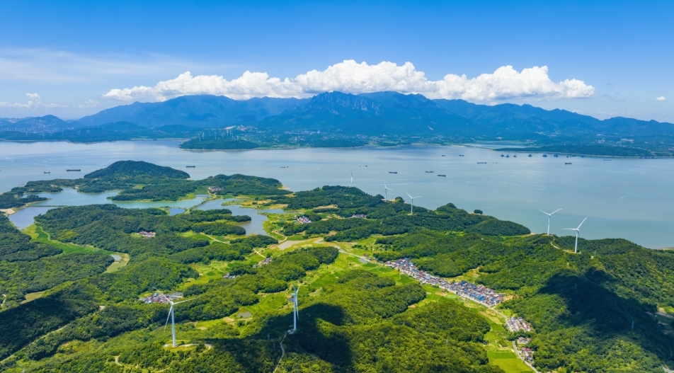 7月24日,在鄱阳湖湖口屏峰水域,鄱阳湖碧波荡漾,船只来往不断,航运繁忙。鄱阳湖西岸的庐山云雾升腾,如同戴上了银色的顶冠。鄱阳湖东岸的湖口县舜德乡,风车转动、田野苍翠、村庄掩映。浩渺鄱湖、巍巍匡庐、山乡村野相映成景,构成一幅生机勃勃的盛夏画卷。(李学华)