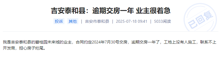 我是吉安泰和县的碧桂园未来城的业主,合同约定2024年7月30号交房,逾期交房一年了,工地上没有人施工,联系不上开发商,担心房子烂尾。