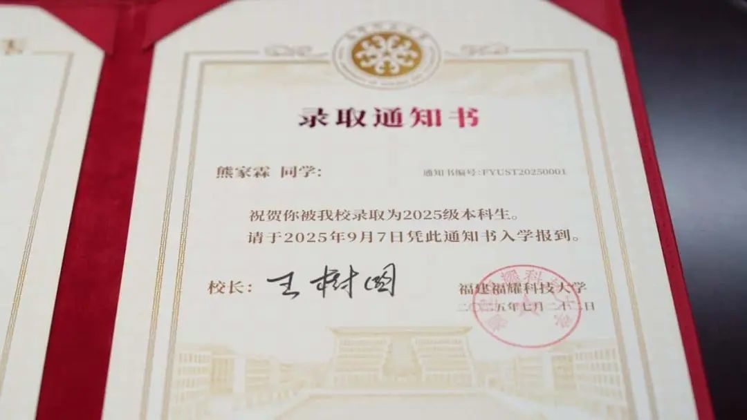 谈及此次录取,熊家霖表示:“这个大学也是我理想中的大学之一,学校的办学理念与我的志向高度契合。”他表示,自己计划选择智能制造工程专业,希望未来能成为工程师,为国家破解智能制造领域难题贡献力量。