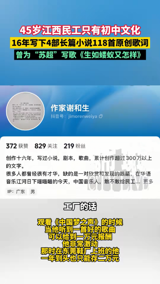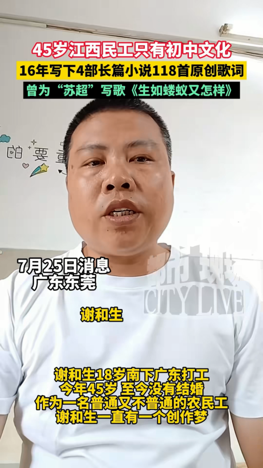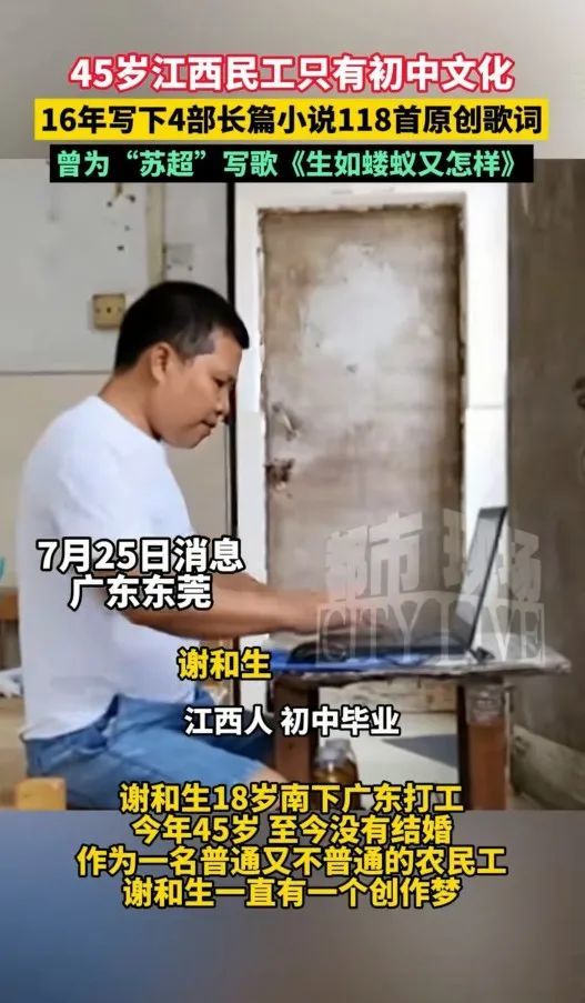 谢和生18岁南下广东打工,今年45岁,至今没有结婚。作为一名普通又不普通的农民工,谢和生一直有一个创作梦。