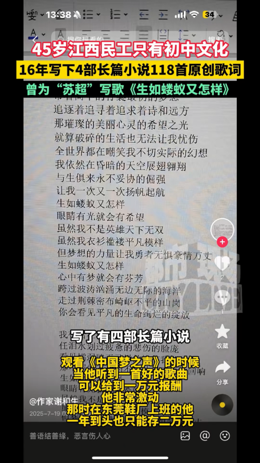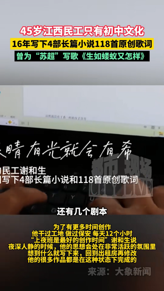 2008年到2024年间,他一边打工一边创作,写了4部长篇小说、5个剧本、118首歌,累计创作超过300万字。但遗憾的是,谢和生还没有卖出去过一部作品。
