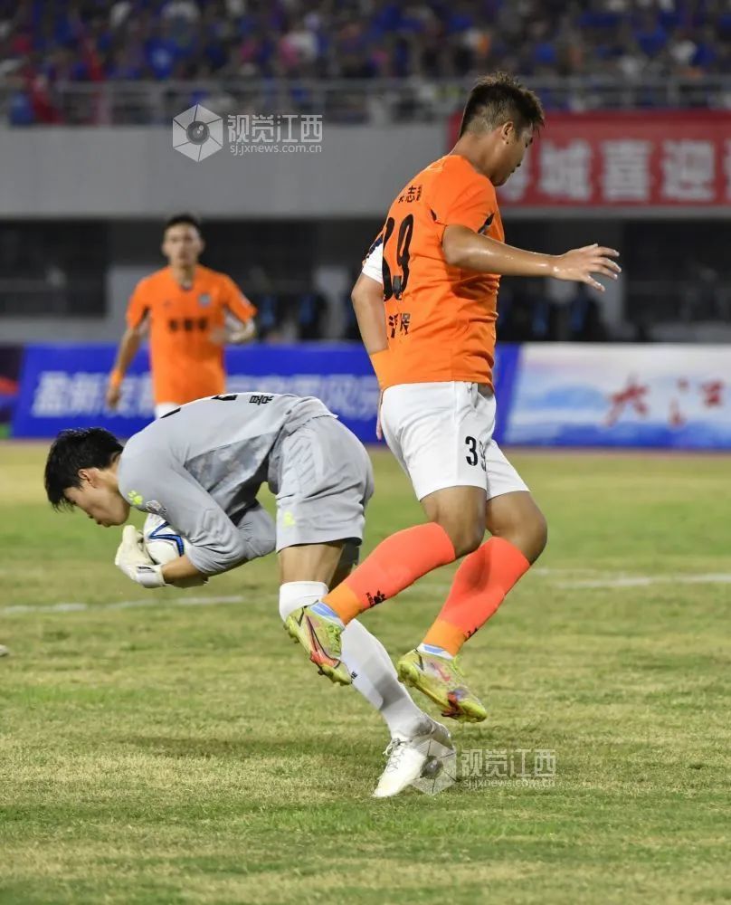 诡异折射扩大优势:第68分钟,景德镇后卫解围失误,九江39号熊士豪抢射,皮球弹地折射破门,2:0!