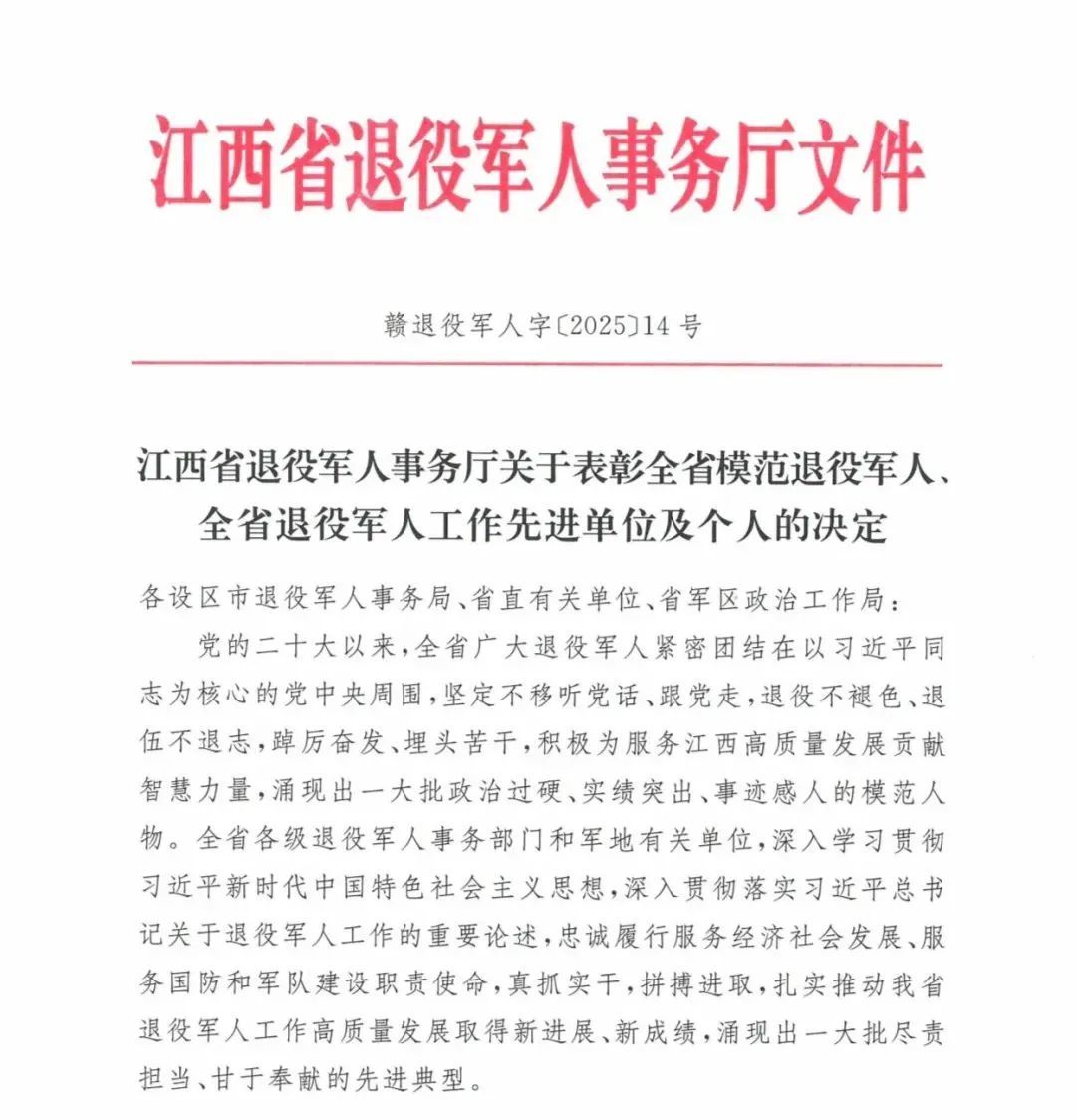 为表彰先进、弘扬正气,进一步引导激励广大退役军人奋进新征程、建功新时代,营造全社会重视支持退役军人工作、关心尊重退役军人的浓厚社会氛围,省退役军人事务厅决定,授予焦林海等100名同志“全省模范退役军人”称号,授予南昌市公安局网络安全保卫支队等30个单位“全省退役军人工作先进单位”称号,授予冯文轩等30名同志“全省退役军人工作先进个人”称号。