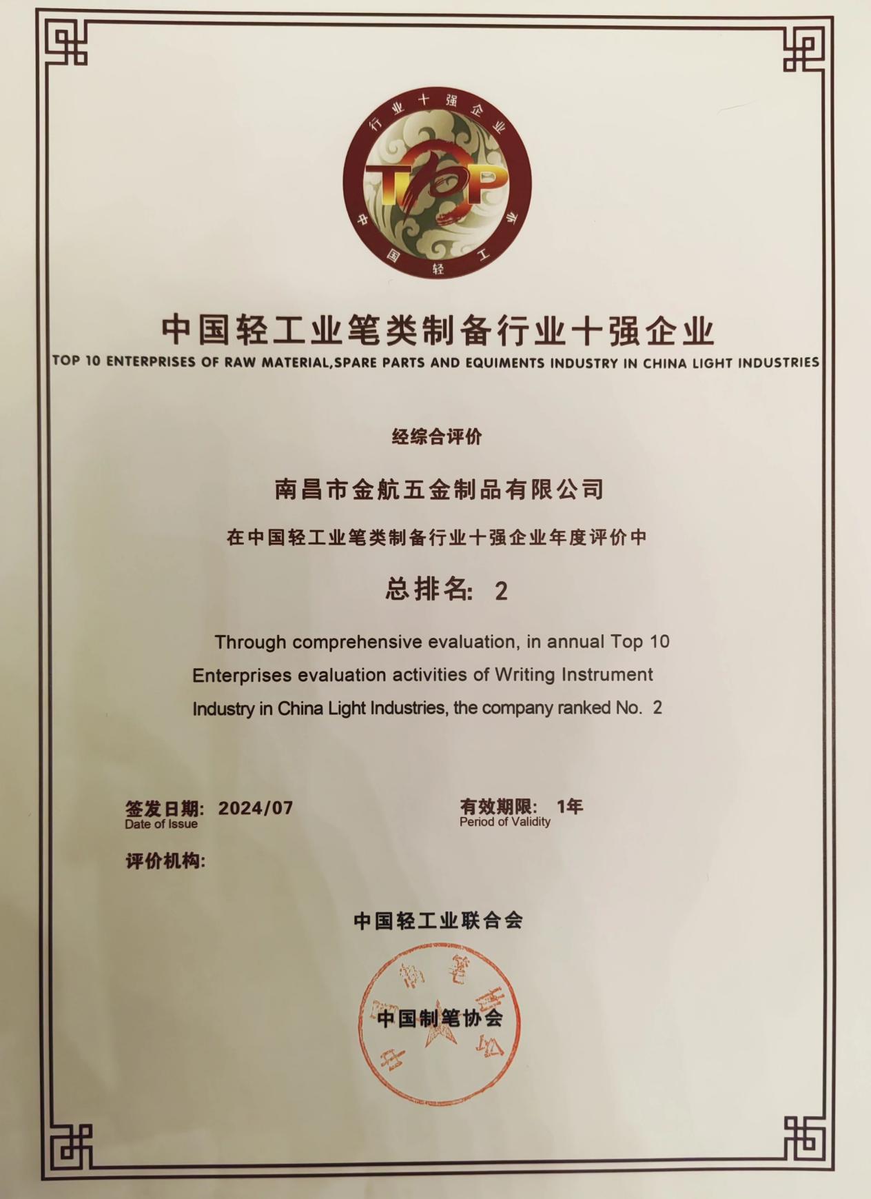 7月29日,位于进贤县文港镇的南昌市金航五金制品有限公司凭借强劲实力,荣登中国轻工业笔类制备行业“十强企业”榜单第二名,为进贤文港制笔产业再添浓墨重彩的一笔!
