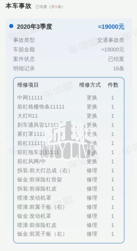 此外,汤先生还通过车信盟平台查询,显示车辆在2020年3季度和2021年2季度分别有过1.9万元和4000元的事故维修记录。汤先生认为,这与商家宣称的“无重大事故”严重不符。