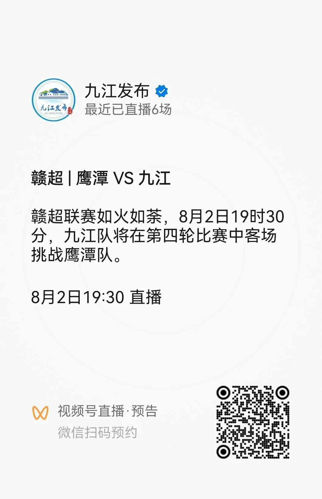 没抢到票的球迷也别遗憾,届时九江市融媒体中心旗下七大平台将全程同步直播,让我们一起守在屏幕前,为九江队呐喊助威!8月2日19时30分,请准时守候在如下平台:掌中九江APP、九江新闻网抖音号、九江发布视频号、云上九江APP、九江日报抖音号、掌中九江微信视频号、九江晨报微博号,让我们在直播间汇合成“最强第十二人”!