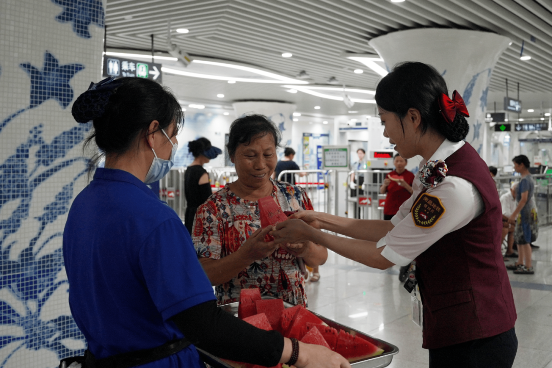 “吃块西瓜再坐地铁吧。”为切实服务高温下出行的市民乘客,南昌地铁于7月29日-8月4日期间在1、2、4号线丁公路北站、翠苑路站等20个车站纳凉区温情启动“清凉‘驿’夏,‘瓜’分甜蜜”关爱活动,为市民乘客免费送上甘甜西瓜。