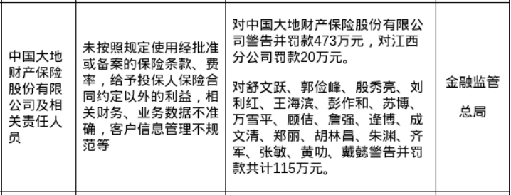 针对以上问题,国家金融监督管理总局对中国大地财产保险股份有限公司警告并罚款473万元,对江西分公司罚款20万元,对多位相关责任人员警告并罚款共计115万元。