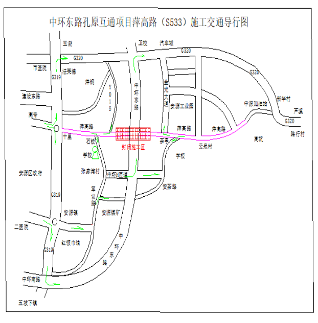 原经萍高路出城的车辆,可绕行319国道、中环东路及320国道通行;原经萍高路进城车辆,可绕行320国道及安源工业园道路通行;详见导行图。