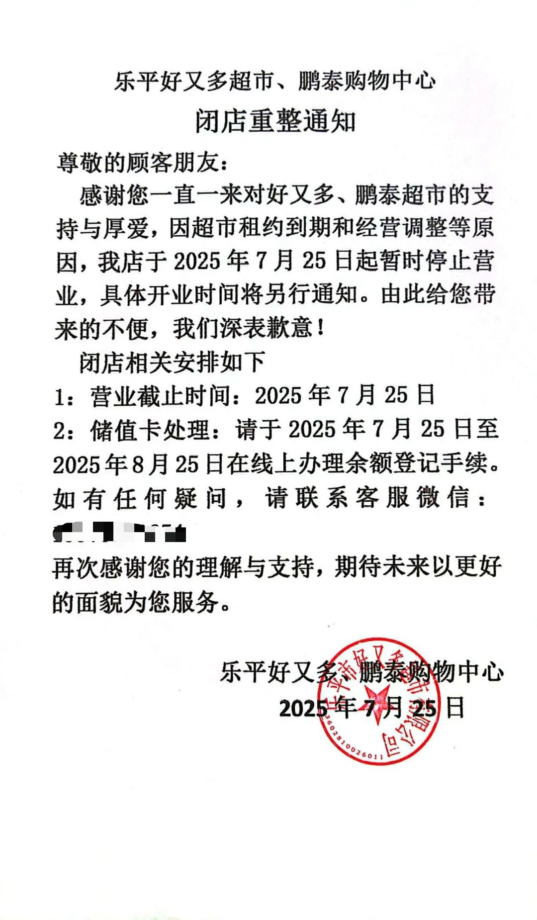都市现场记者注意到,7月25日,超市方曾发布《闭店重整通知》,称因“租约到期和经营调整等原因”于当日停止营业,并通知持储值卡顾客于7月25日至8月25日在线办理登记。