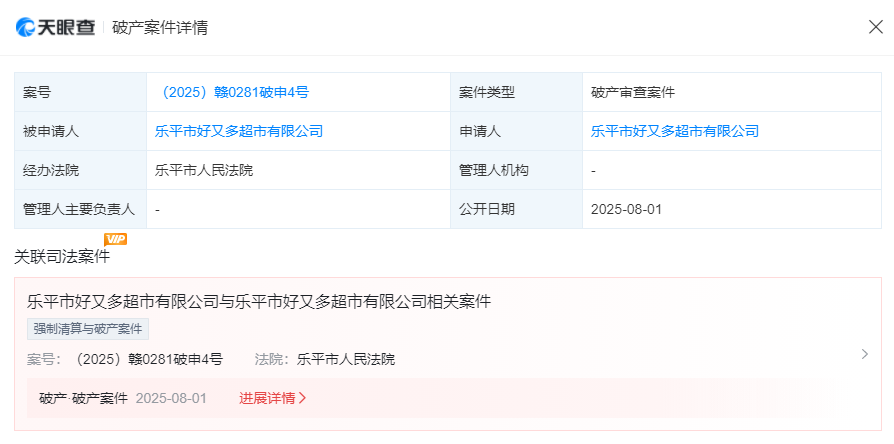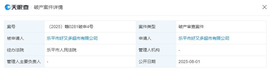 8月4日,都市现场通过查询天眼查发现,乐平市好又多超市有限公司已于8月1日申请破产预重整,经办法院为乐平市人民法院。