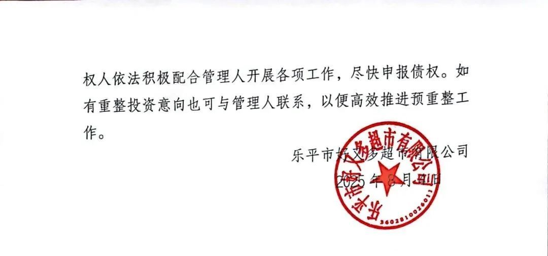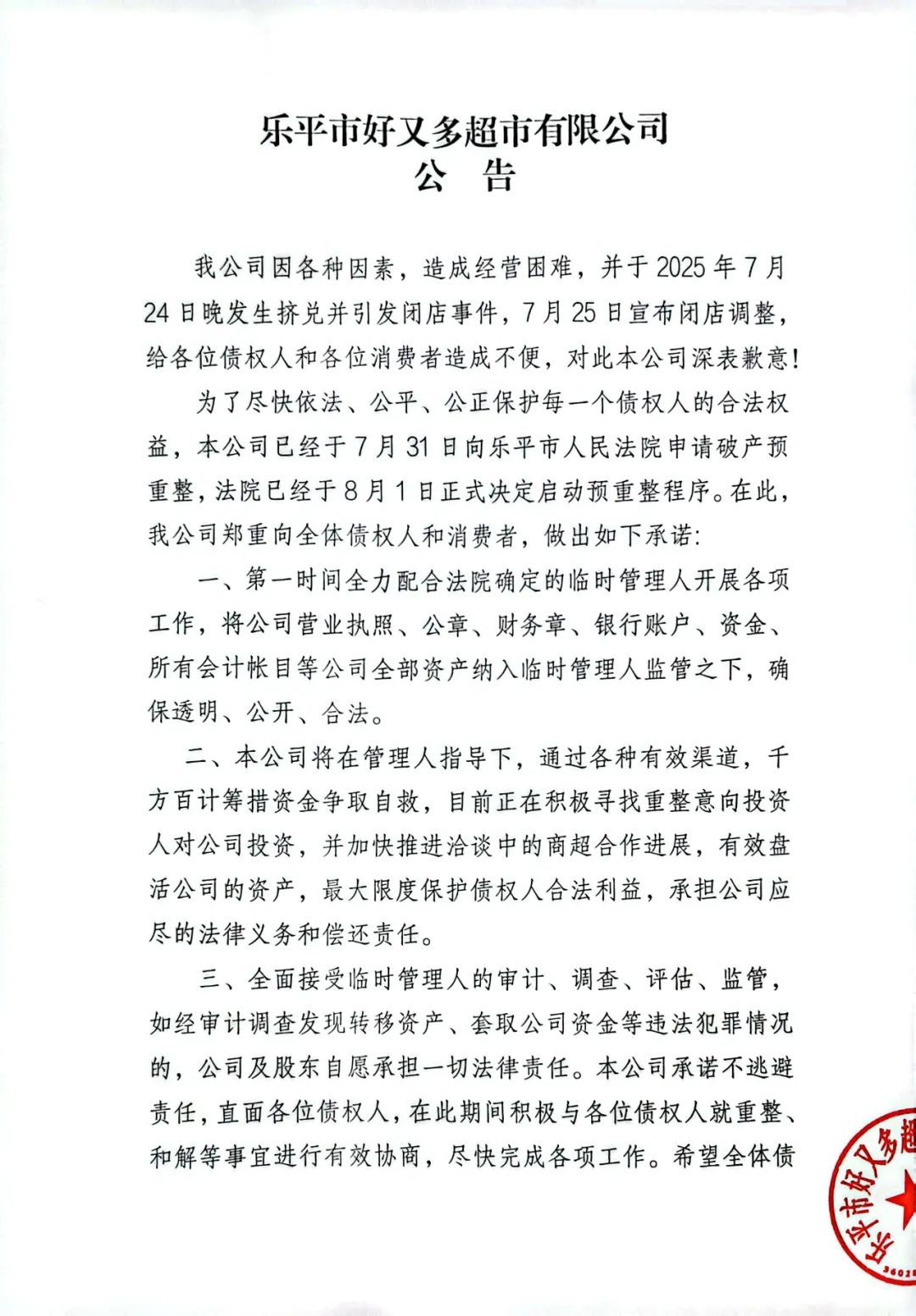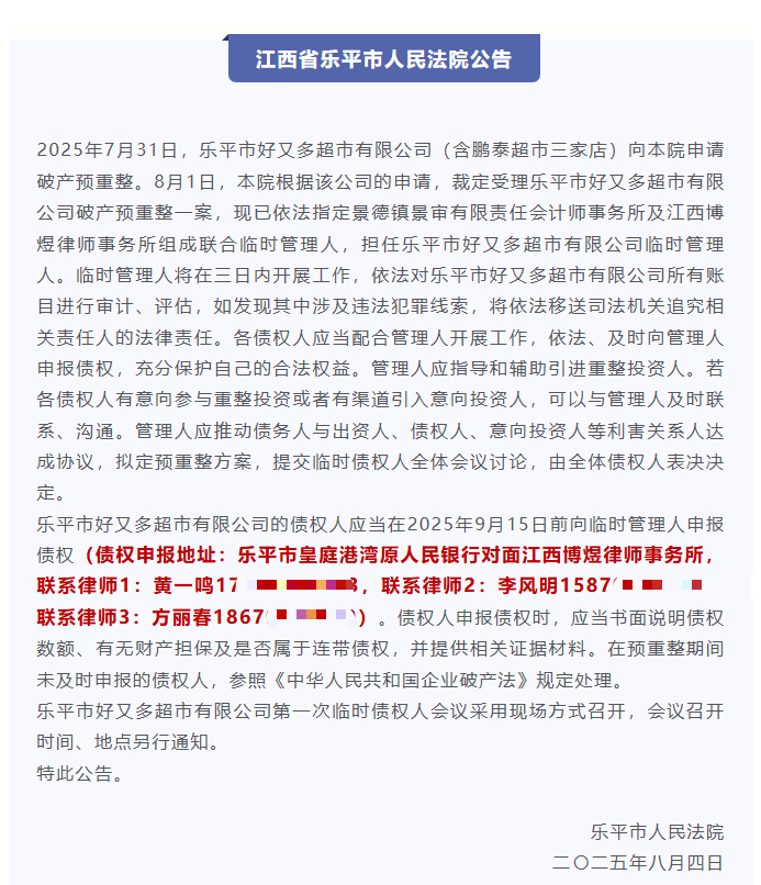 记者注意到,8月4日上午,乐平市好又多超市有限公司官方微信公众号发布公告称,公司已经于7月31日向乐平市人民法院申请破产预重整,法院已经于8月1日正式决定启动预重整程序。