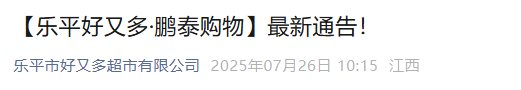 都市现场记者了解到,8月4日上午,乐平市人民法院发布公告称,2025年7月31日,乐平市好又多超市有限公司(含鹏泰超市三家店)向该院申请破产预重整。
