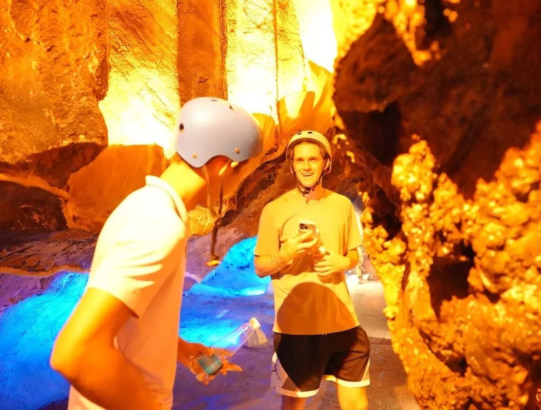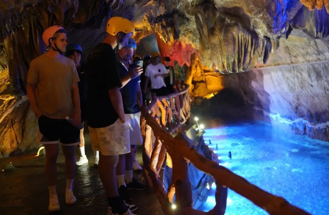 球员们沿着蜿蜒的洞内步道前行,地下暗河贯穿全洞,与陆地交错分布。在精心布置的声光电投影效果中,仙人梯田、寿星洗头等多处景观宛如梦幻仙境,让这些走遍全球的运动员们惊喜不已。