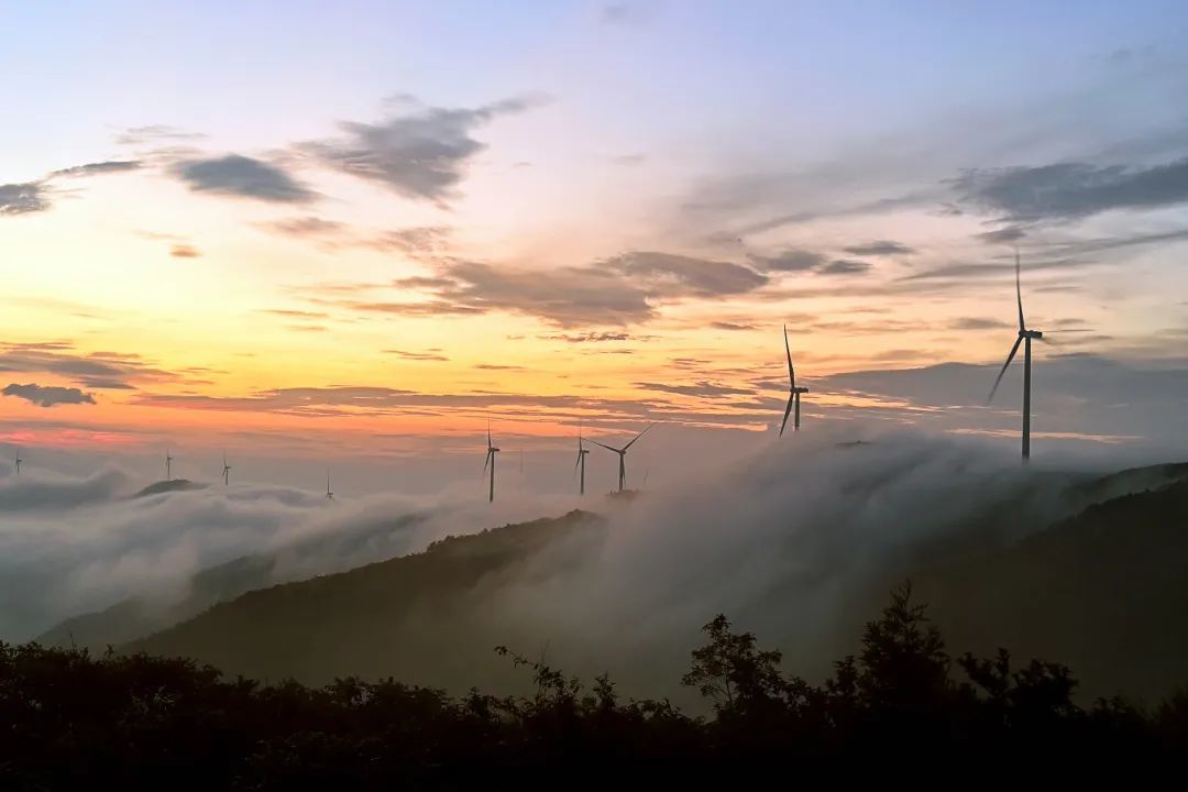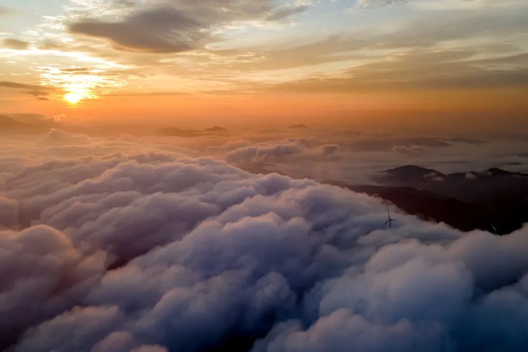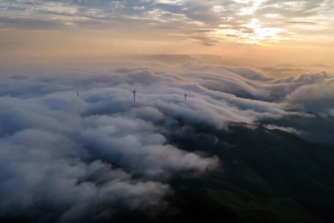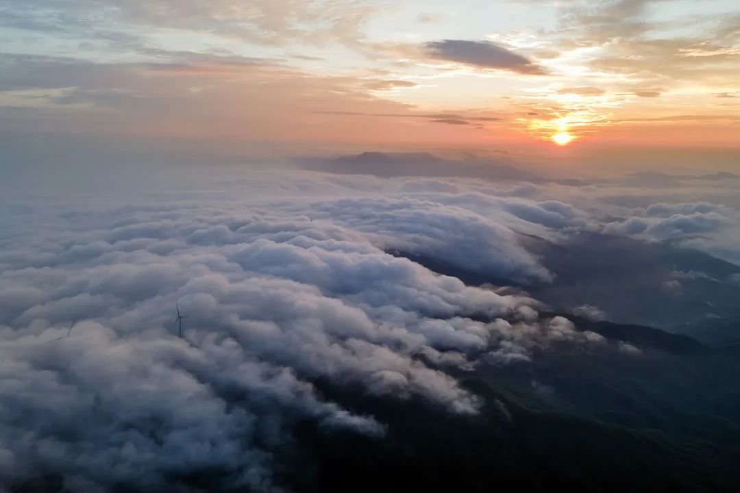 近日,航拍宜丰县石花尖垦殖场太阳岭,晨曦云海映衬的风力发电机组忽隐忽现,宛如仙境。(周海彬 摄)