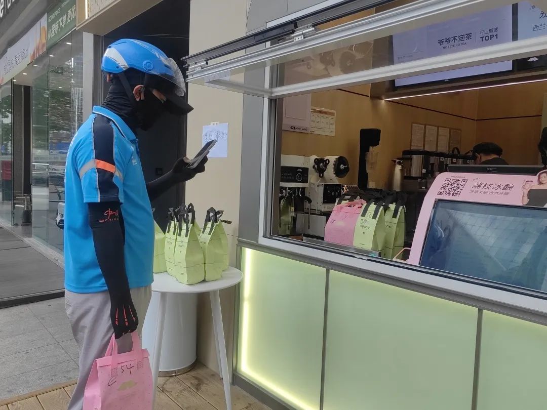 一旁的古茗奶茶店,一名外卖小哥直接将一箱奶茶放上电动车,他说:“这是一个公司下的单,一共有23杯!”