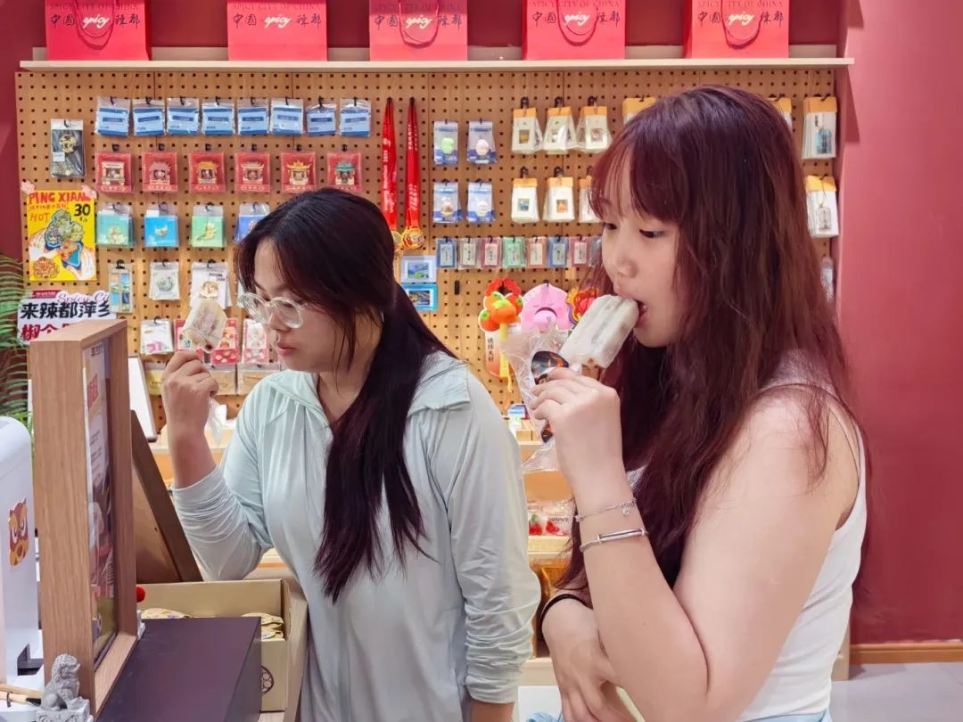 “萍乡好物”文创店的工作人员告诉小布,这款极具反差感的辣冰棍是新推出的试验性文创产品,其创意来源于“中国辣都”这张闪亮的城市名片。首批试制的辣冰棍上架后几乎“秒光”,紧赶着推出的第二批,热度依然不减,俨然成了吸引游客打卡的“新晋网红”。“在制作辣冰棍的过程中,我们尝试过多种方案,”店长刘怡瑾向小布“揭秘”,“有的辣度过猛,有的口感欠佳,反复调试才最终锁定了现在这个口味,辣度均衡又富有萍乡特色。”