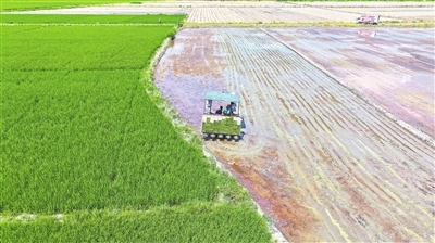 8月4日,在吉安市吉州区曲濑镇水南村水稻种植基地,农机手驾驶插秧机抢插晚稻。