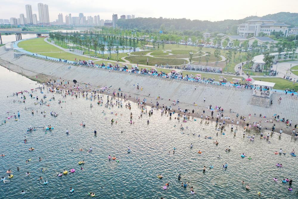 8月5日,在上高县口袋公园的天然游泳场内,市民在戏水消暑。
