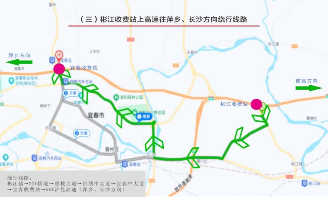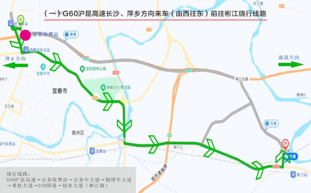 绕行线路:彬江镇→220国道→重枝大道→锦绣中大道→宜春中大道→宜春收费站→G60沪昆高速(萍乡、长沙方向)