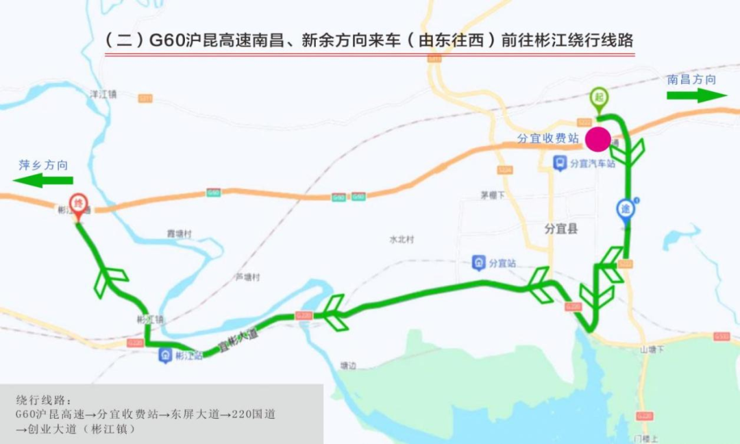 绕行线路:彬江镇→220国道→东屏大道→分宜收费站→G60沪昆高速(新余、南昌方向)