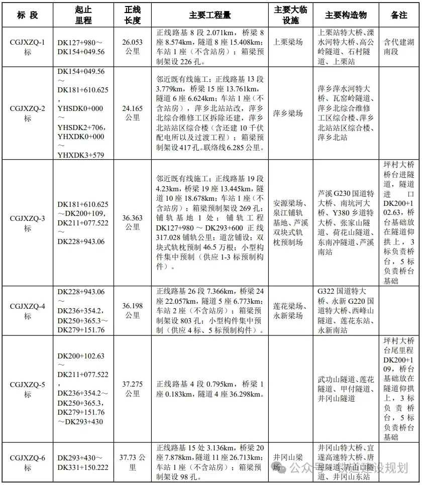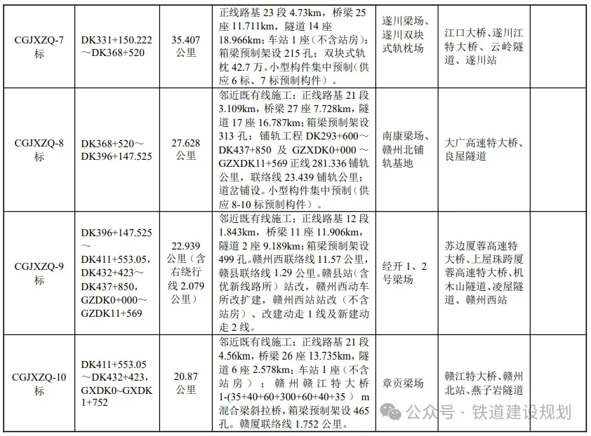 本次施工招标划分为10个标段,详见下表。其中铺轨工程分别由3标和8标承担。