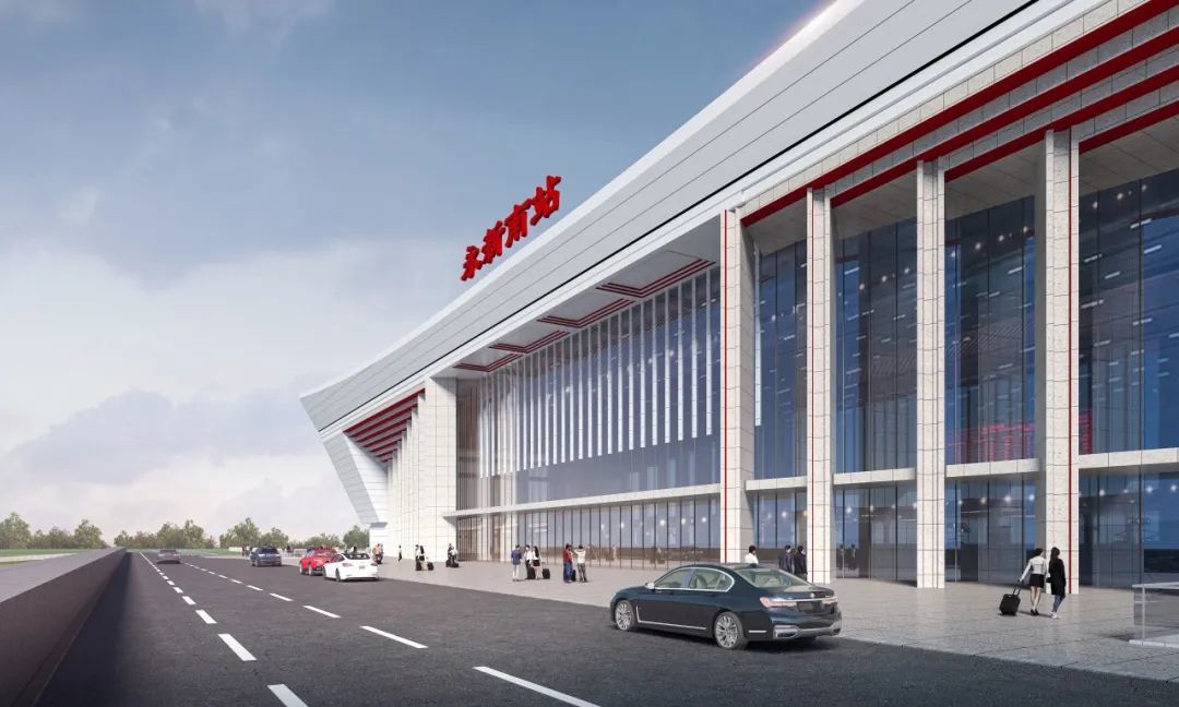 ①永新南站位于江西省吉安市永新县境内,车场规模为2台4线。方案以“日永月新·革命丰碑·旌旗永扬”为设计理念,运用建筑意象的凝练表达与当代建构技艺,将地域文脉与革命精神熔铸于站房建筑设计中。