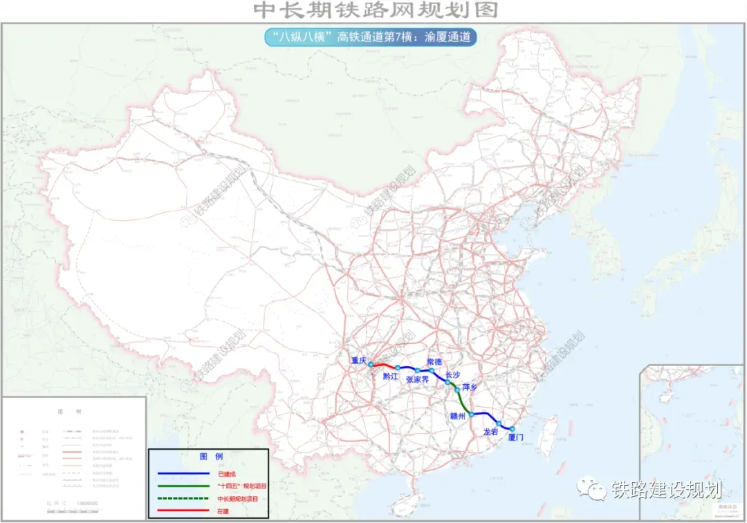 渝长厦通道全长约1700公里,起止点为厦门和重庆,途经长沙,由7月1日即将通车的重庆至黔江高铁,已建成黔张常铁路、常益长高铁、赣瑞龙铁路、龙厦铁路以及拟建的长赣高铁组成,设计时速200-350公里不等。