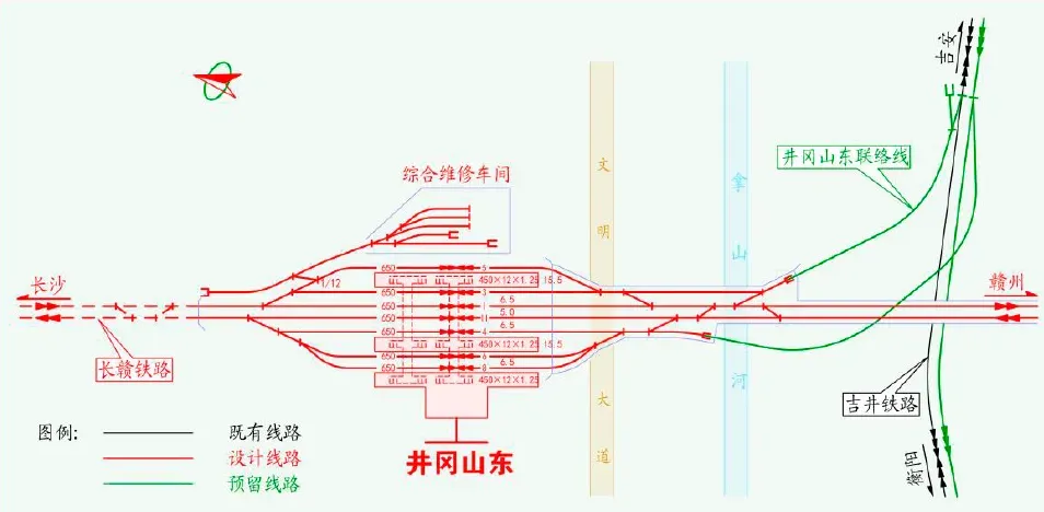 ②井冈山东站位于井冈山市新城区拿山乡贵溪村东侧,车站南端上跨G319、拿山河,距市政府2km,距既有井冈山站3km,距茨坪景区26km。车站按3 台7 线(含正线)规模布置,主要办理旅客列车到发、通过及旅客乘降等业务,以通过作业为主。