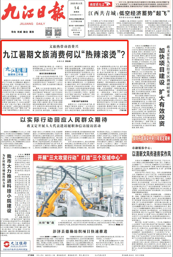 盛夏的庐山牯岭街游人如织,游客循着庐山千年诗韵,在云雾缭绕间,邂逅诗人的仙风足迹,体验一场诗意的NPC寻仙之旅;夜晚的“浔阳·九点九江”省级夜间文旅消费集聚区人头攒动,烟火升腾的夜市摊前,游客感受九江烟火气的同时兴致勃勃地讨论明天的行程;风光旖旎的八里湖九派水上乐园,清凉九派·泼水狂欢季,点燃了盛夏文旅消费激情……这些鲜活的场景,映射着在文旅融合热潮下,九江暑期文旅消费“热辣滚烫”的新气象。今年以来,我市聚焦“做旺旅游人气、拉动文旅消费”目标,深化“文旅+百业”融合,多措并举创新文旅“新供给”,全景式推进文旅消费升级,积极培育“演艺+文旅”“赛事+文旅”“低空+文旅”等新消费增长点,推动文化休闲、旅游出行等需求集中释放,进一步激发文旅消费新动能,让“诗与远方”融入市井烟火,促进文旅消费市场热力迸发。