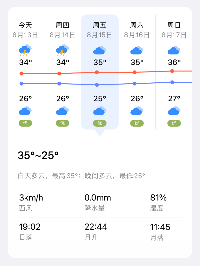 根据最新气象信息,预计8月15日明月山温汤旅游度假区以多云为主,气温25℃-35℃,当日无降水。