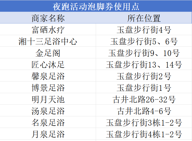参与夜跑活动可免费获取温汤富硒温泉泡脚券一张,参与活动的店铺将悬挂夜跑活动横幅,具体有:
