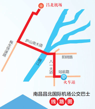 ●从火车站开往昌北机场方向:火车站—站前路—八一大道—阳明路—八一大桥—庐山南大道—枫生快速路—绕城高速—机场大道—昌北机场;