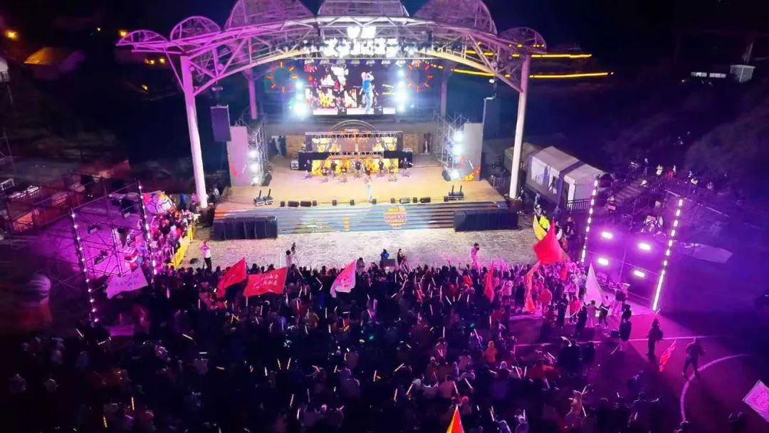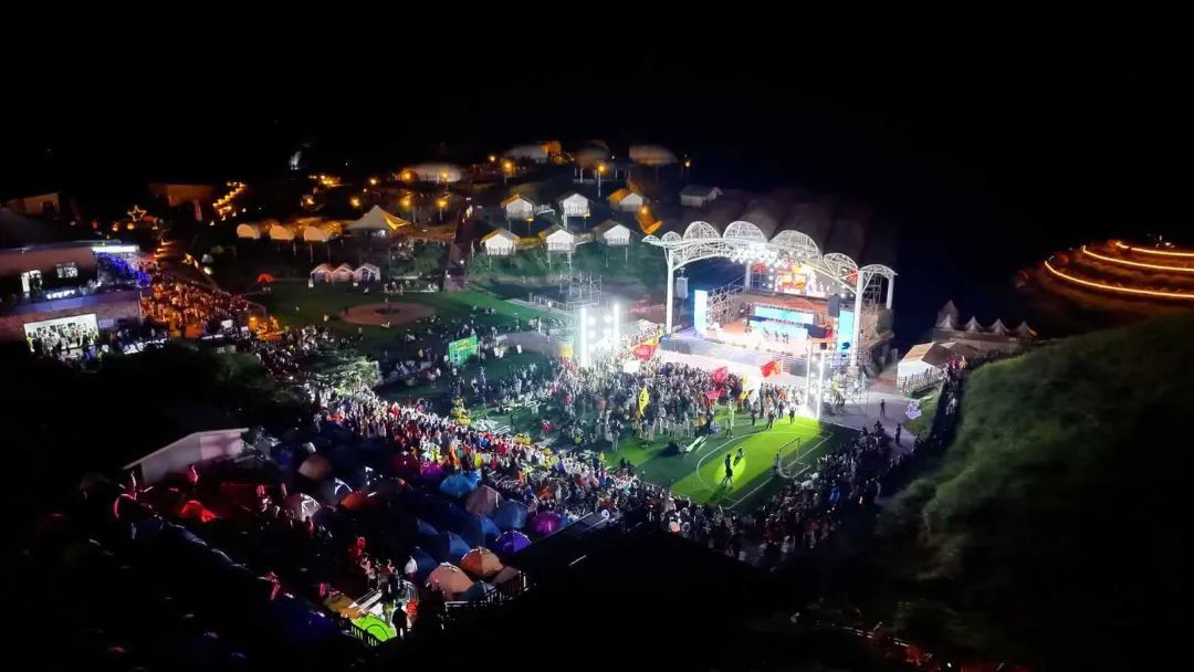 晚上7时30分,观音宕营地大舞台的晚会准时启幕,将蹦迪DJ派对的热辣、烟花秀的绚烂、篝火晚会的热闹交织在一起,打造一场沉浸式的山野狂欢。台上,说唱歌手的音乐裹挟着山风入耳,舞者的裙摆随风带起弧度,引来满场阵阵欢呼;台下,荧光棒在男女老少手中随着节奏轻晃,形成流动的光海。一位银发奶奶格外惹眼,尽管动作不算利落,攥着荧光棒的手却正跟着节奏轻轻摆动。刚背着登山包来到营地的游客,顾不上擦拭额头上的汗珠,将背包往草甸上一放,一同加入摇摆的队伍,疲惫感瞬间被热闹冲散。