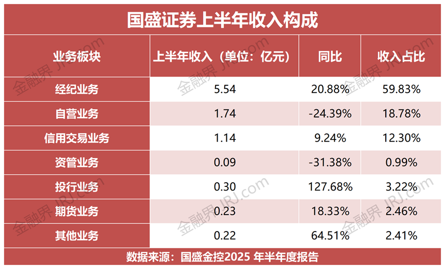 然而,拆解国盛证券的收入结构便能发现隐忧:传统经纪业务独占5.54亿元,占比接近六成;投行、自营、资管、信用交易虽各有涨跌,却无一能撼动经纪的绝对优势。