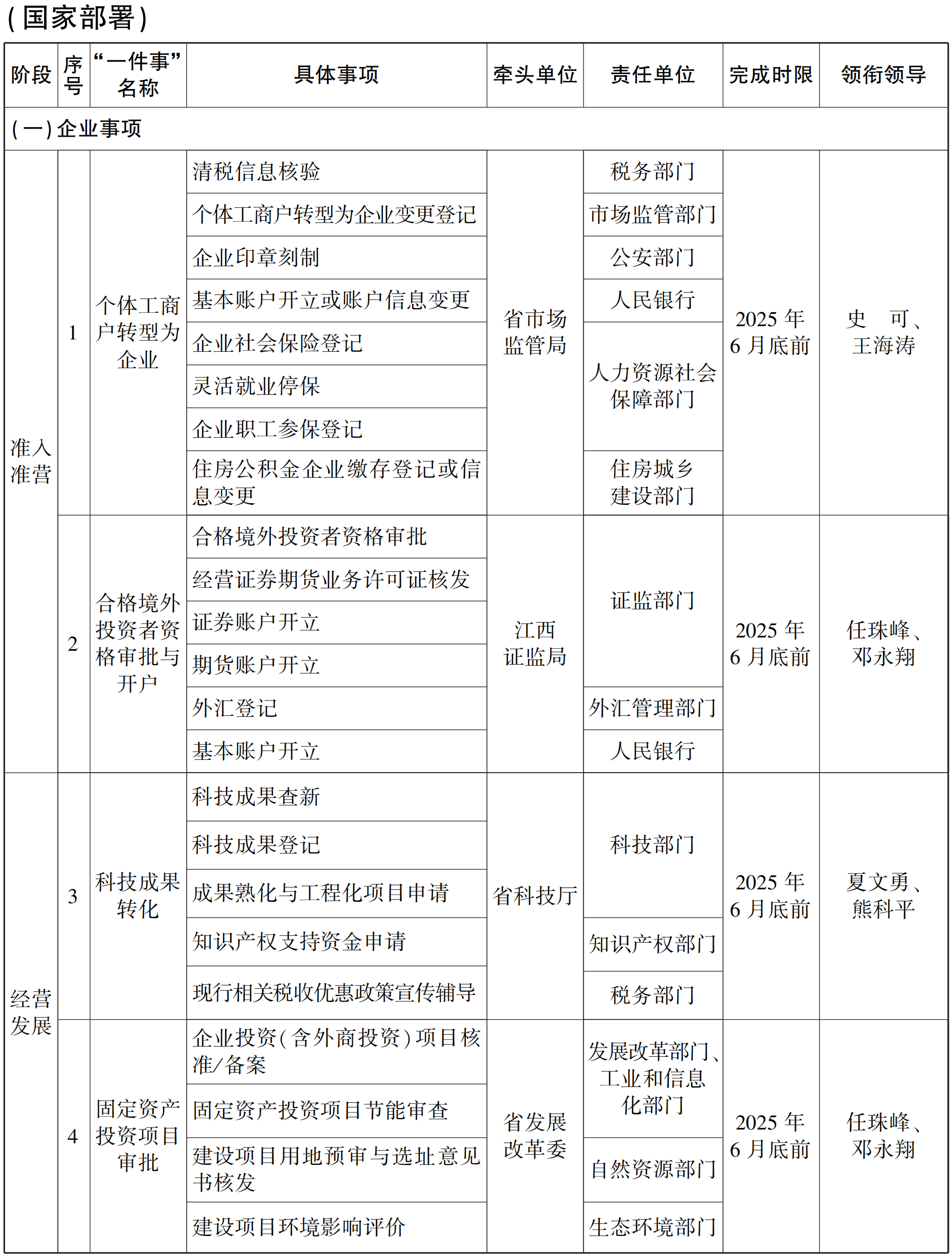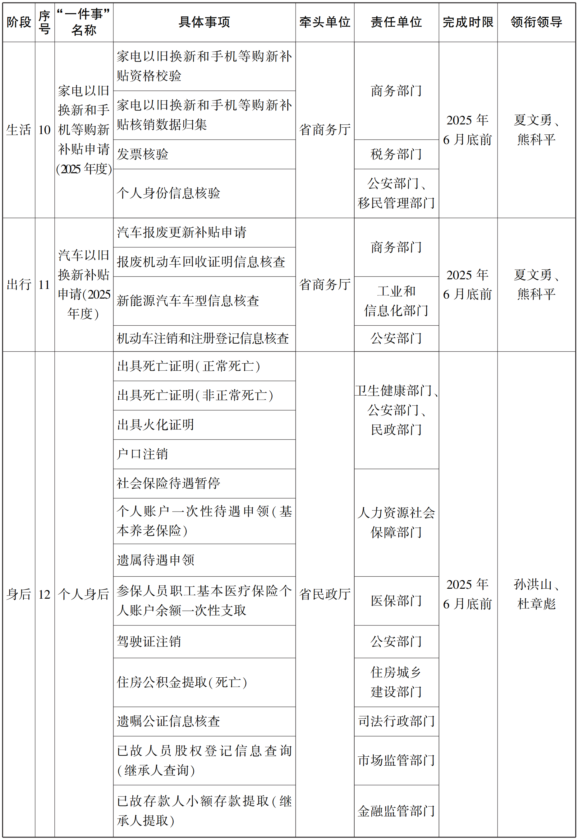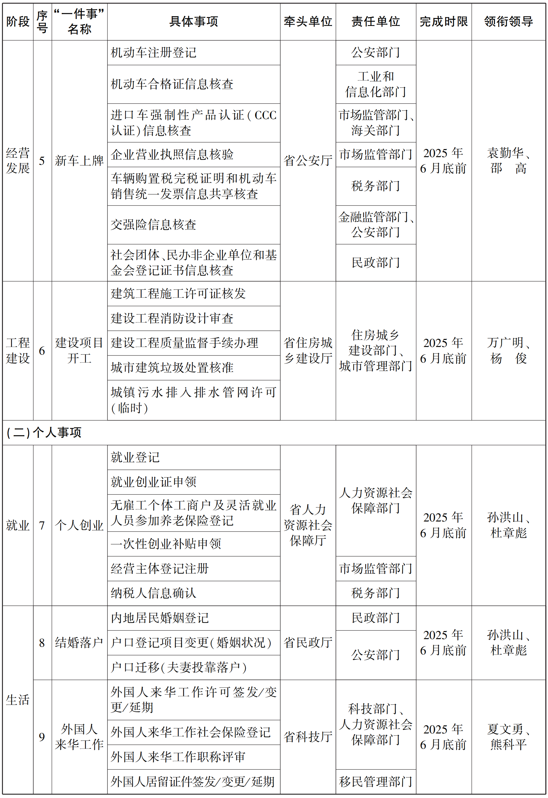 1、个体工商户转型为企业;2、科技成果转化;3、固定资产投资项目审批;4、新车上牌;5、建设项目开工;6、个人创业;7、结婚落户;8、外国人来华工作;9、家电以旧换新和手机等购新补贴申请(2025年度);10、汽车以旧换新补贴申请(2025年度);11、个人身后;12、员工离职;13、企业纳税;14、二手车交易;15、身份信息变更。另有由国家部委牵头的合格境外投资者资格审批与开户。