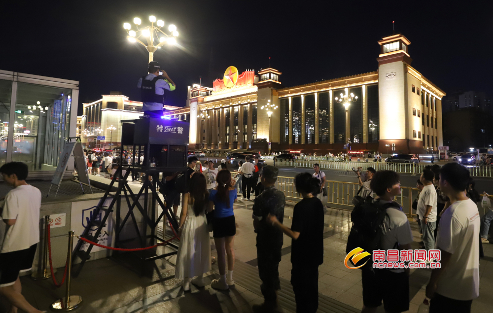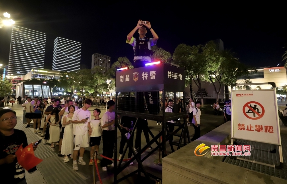 8月18日晚,八一广场聚集着大量游客,特警队员执勤之余,兼职当起“摄影师”。记者在广场上看到,游客们排着队把手机递给站在高处的特警队员,等待特警帮忙拍照。特警队员接过手机,熟练地调整角度、构图,在游客的手机里留下一张张好看的照片。南昌特警的暖心行动,在社交平台收获无数点赞。(洪观新闻记者 杨紫韬 摄)