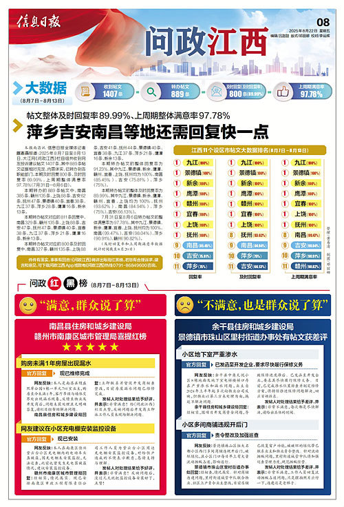 发帖人对处理结果给予好评,并表示:非常满意!给《问政江西》栏目点赞,反映问题后开发商立即派工作人员来现场解决问题。