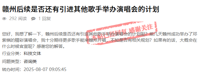 您好,我想了解一下,赣州后续是否还有引进其他歌手举办演唱会的计划呢?前段时间赣州成功举办了邓紫棋的精彩演唱会,我十分期待更多歌手能来赣州开唱,不知是否有相关规划?如果有的话,大概会在什么时候官宣呢?感谢您的解答。