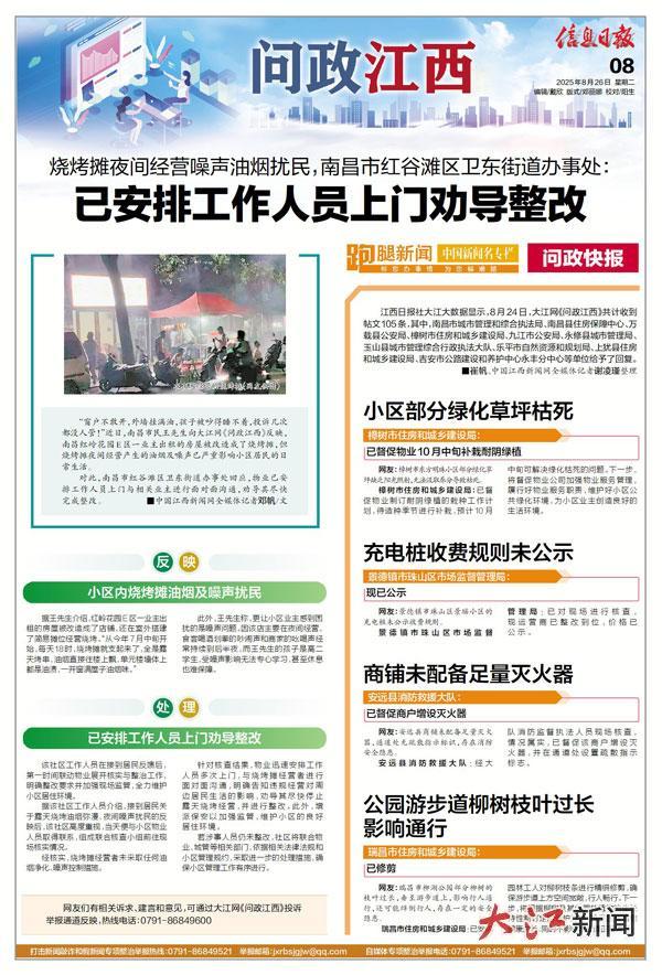 江西日报社大江大数据显示,8月24日,大江网《问政江西》共计收到帖文105条,其中,南昌市城市管理和综合执法局、南昌县住房保障中心、万载县公安局、樟树市住房和城乡建设局、九江市公安局、永修县城市管理局、玉山县城市管理综合行政执法大队、乐平市自然资源和规划局、上犹县住房和城乡建设局、吉安市公路建设和养护中心永丰分中心等单位给予了回复。