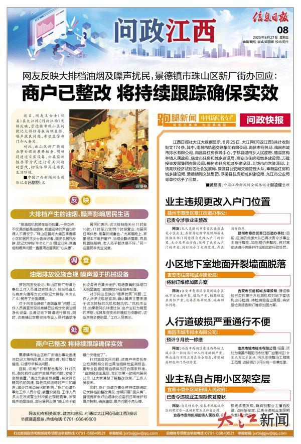江西日报社大江大数据显示,8月25日,大江网《问政江西》共计收到帖文174条,其中,南昌市轨道交通集团有限公司、南昌市商务局、南昌市城市排水有限公司、南昌县住房保障中心、宁都县湛田乡人民政府、赣县区梅林镇人民政府、瑞金市住房和城乡建设局、高安市住房和城乡建设局、万载投资发展集团有限公司、樟树市住房和城乡建设局、上饶市自然资源局、上饶高铁经济试验区社会发展局、婺源县公安局交通管理大队、奉新县住房和城乡建设局、景德镇陶文旅集团、浮梁县住房和城乡建设局、九江市公安局等单位给予了回复。