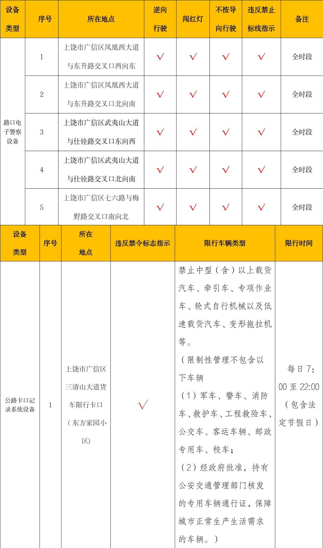 为保障群众出行安全和道路交通畅通,预防和减少道路交通事故发生,全力营造良好的道路交通安全环境,依据《中华人民共和国道路交通安全法》《中华人民共和国道路交通安全法实施条例》《江西省实施<中华人民共和国道路交通安全法>办法》等相关法律法规,将于 2025年9月06日零时起,在广信区范围内启用一批交通技术监控设备。现将具体信息公告如下: