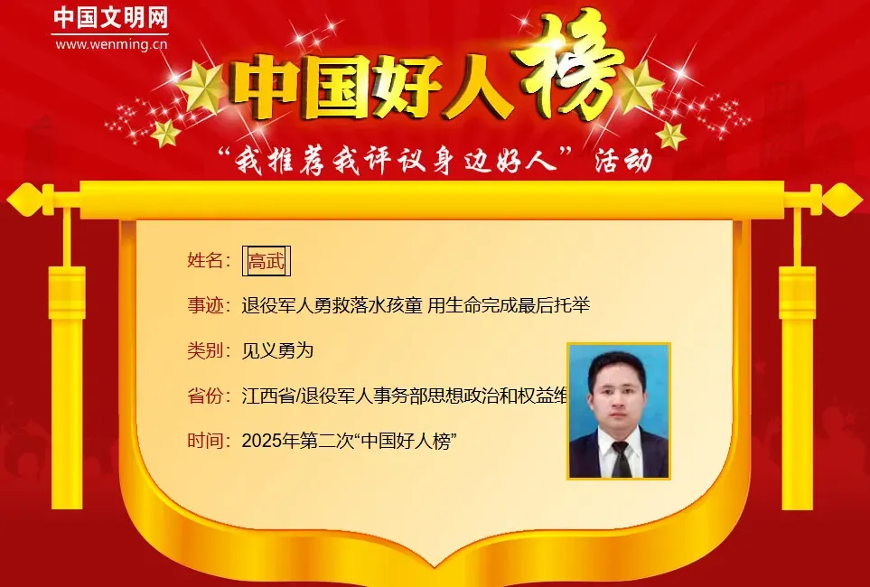 高武,男,1983年1月生,中共党员,江西省上饶市鄱阳县莲湖乡表恩村村民、武警退役军人。2025年5月1日上午,高武带着妻女到浙江省温州市楠溪江阿青烧烤露营地度假。上午10时许,正与妻女在岸边游玩的高武突然看到一名9岁男孩不慎滑入湍急的江水中。千钧一发之际,高武毫不犹豫跳入水中,入水后他始终将孩子高高托起,自己的头部却淹没在水下,像一座沉稳的“人桥”,用身体为孩子撑起呼吸的空间,任凭急流将他推向更危险的深处。在湍急的河水中托举孩童近20分钟后,男孩最终获救,他却因体力不支溺水,经抢救无效不幸遇难。