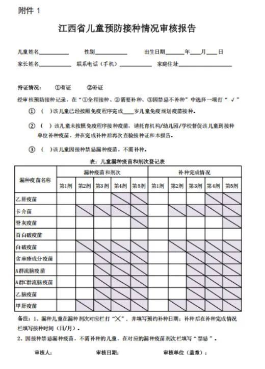 3、入学后,儿童监护人接到补种通知后,应尽快带孩子到当地预防接种门诊确认并完成补证或补种。完成补证或补种后,家长需要将“审核报告”再次交给托幼机构/学校查验。