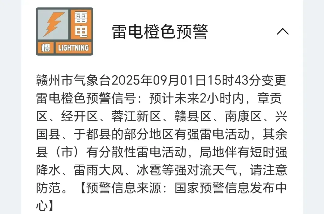 【预警发布中心】赣州市气象台2025年09月01日15时43分变更雷电橙色预警信号:预计未来2小时内,章贡区、经开区、蓉江新区、赣县区、南康区、兴国县、于都县的部分地区有强雷电活动,其余县(市)有分散性雷电活动,局地伴有短时强降水、雷雨大风、冰雹等强对流天气,请注意防范。
