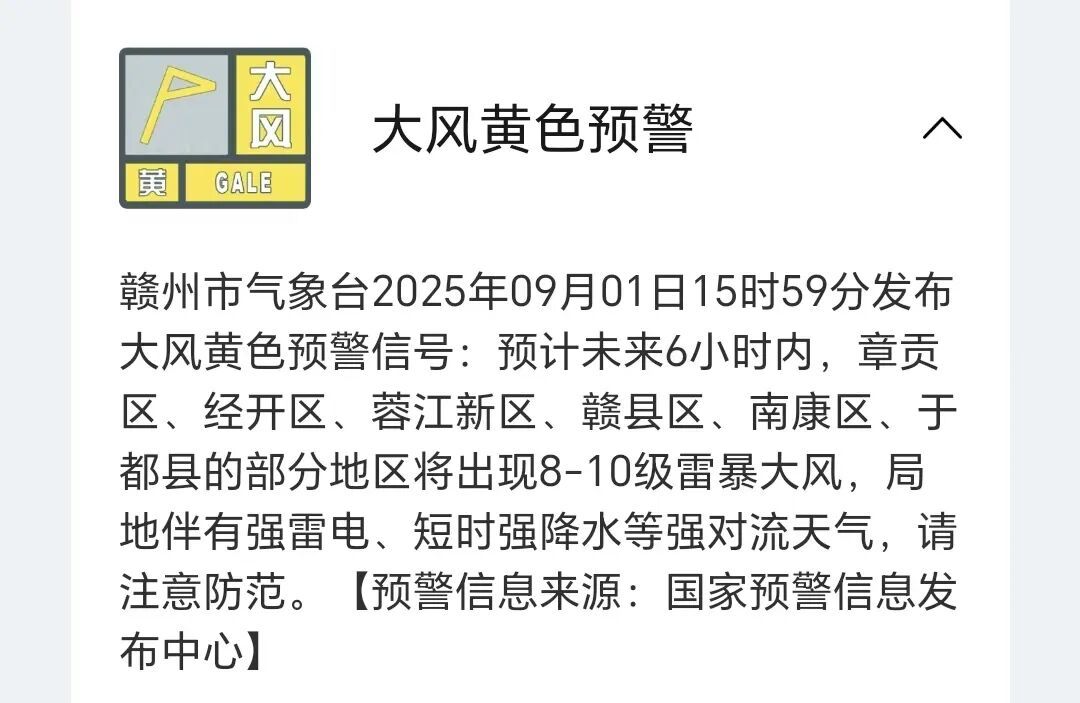 【预警发布中心】赣州市气象台2025年09月01日15时59分发布大风黄色预警信号:预计未来6小时内,章贡区、经开区、蓉江新区、赣县区、南康区、于都县的部分地区将出现8-10级雷暴大风,局地伴有强雷电、短时强降水等强对流天气,请注意防范。
