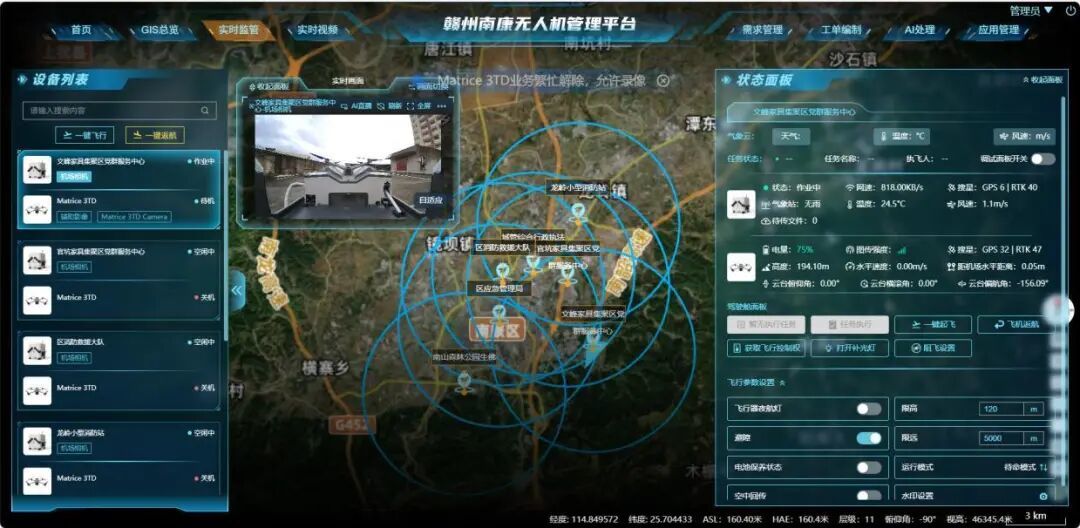 南康区聚焦破解城市治理工作中传统人工巡检效率低、覆盖面窄、响应不及时等难题,深化探索无人机参与城市治理等场景应用,打造建成全省首个“一网统飞”低空城市管理平台,该平台集“远距预警、身份识别、精准定位、全程跟踪、高效管制”等技术于一体,覆盖公安、城管、消防、应急、交管、住建、环保、自然资源、水利等城市九大核心管理部门职能,推动无人机技术与行政管理执法深度融合,进一步提升了城市治理效能。